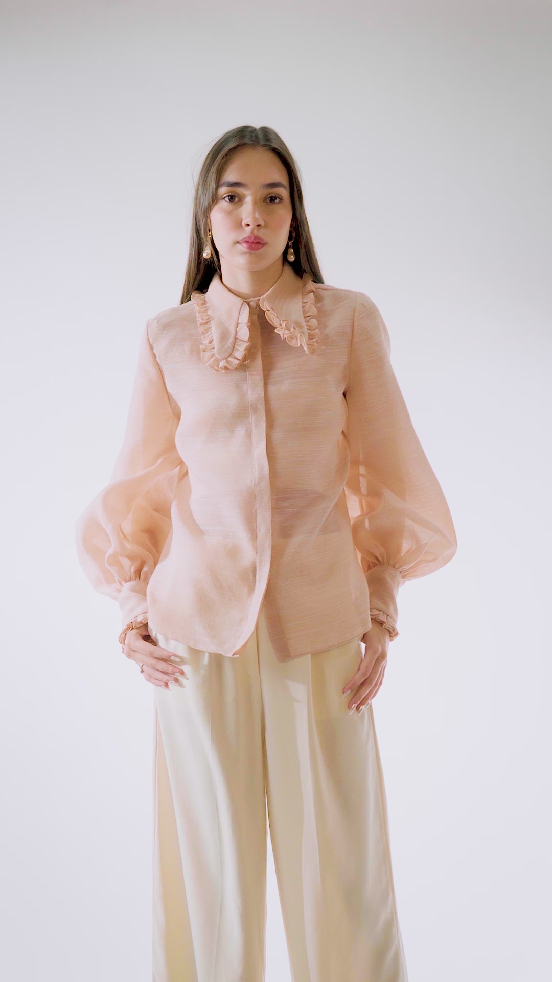 The Annie Blouse is rendered in barong cotton—airy and textural—dyed in a delicate light coral hue that invites warmth and radiance. Designed to feel as soft as it looks, this blouse balances structure with softness through gathered wrist cuffs, gentle sleeve volume, and a refined ruffled collar.