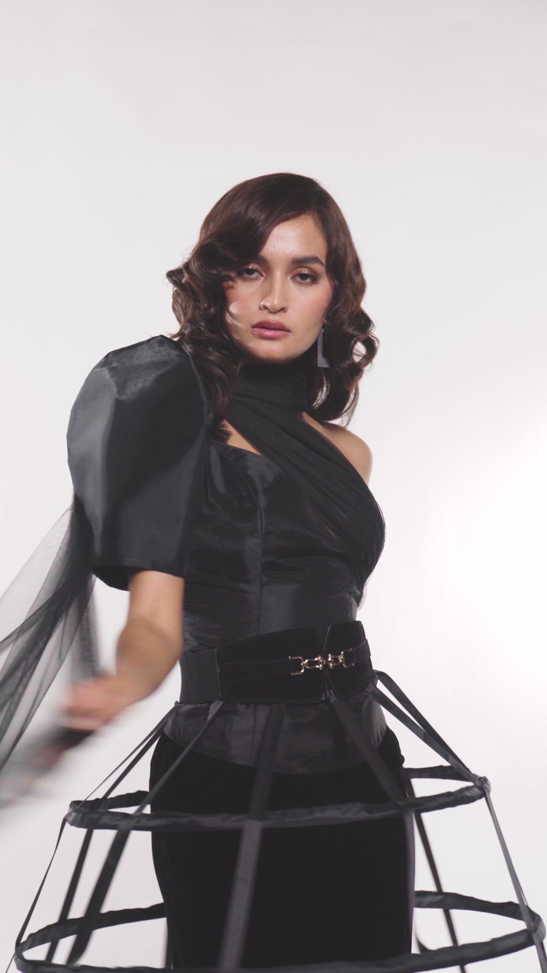 The Glass Drift Top is a modern Filipiniana study in structure and movement. Sculptural shoulders extend the frame while the asymmetrical butterfly sleeve softens the silhouette, balancing architectural precision with fluid drape.