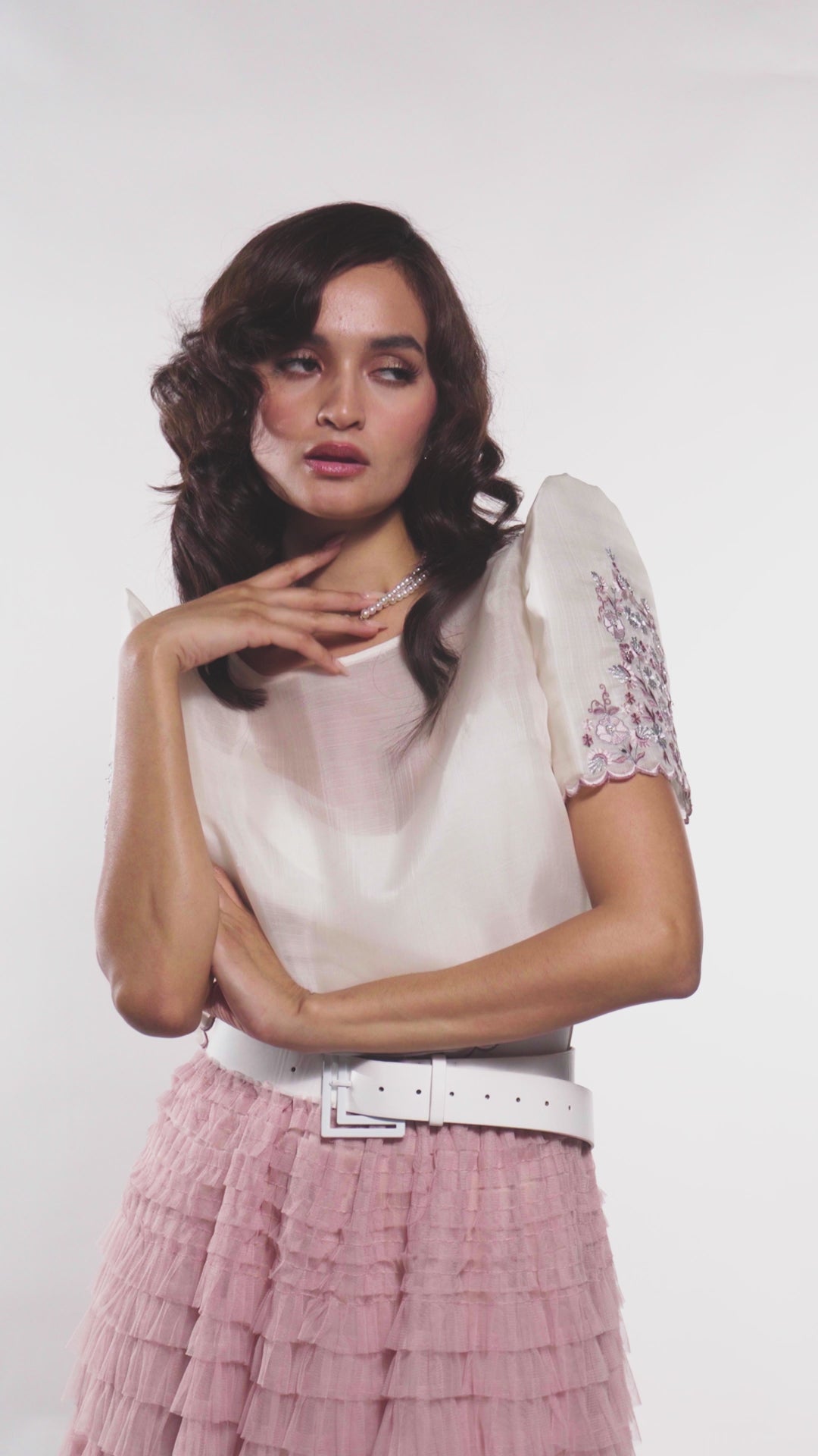 Scalloped edges finish the hemline with refinement, tracing the waist in a soft architectural curve.