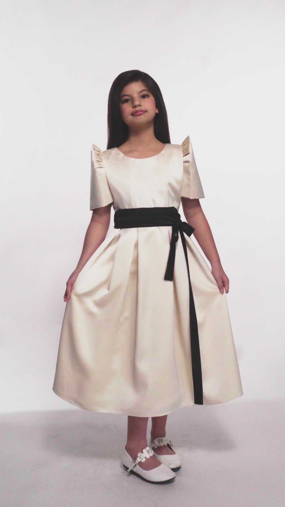 Cut from ivory duchesse silk, the silhouette holds its form gently—structured yet softened in movement. A tie black belt defines the waist with quiet intention, introducing contrast without excess.